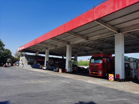 加油區(qū)設(shè)置加油罩棚,罩棚下設(shè)置3臺(tái)雙油品四槍潛泵式加油機(jī)和3臺(tái)三油品六槍潛泵式加油機(jī);埋地罐區(qū)設(shè)有6只SF雙層埋地油罐,其中30m3汽油罐4只(92#2只、95#1只、98#1只)、30m3柴油罐2只(0#),折算后油罐總?cè)莘e150m3(柴油罐折半計(jì)入),依據(jù)《汽車加油加氣加氫站技術(shù)標(biāo)準(zhǔn)》GB50156-2021第3.0.9條辨識(shí),該站屬于二級(jí)加油站。加油站已安裝汽油卸油和加油油氣回收系統(tǒng)。