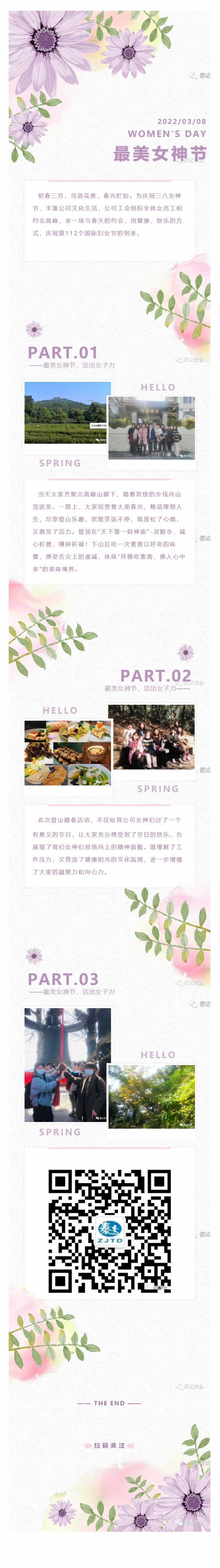 初春三月,鳥語花香,春光爛燦。為慶祝三八女神節(jié),豐富公司文化生活,公司工會組織全體女員工相約北高峰,來一場與春天的約會,用健康、快樂的方式,慶祝第112個(gè)國際婦女節(jié)的到來。